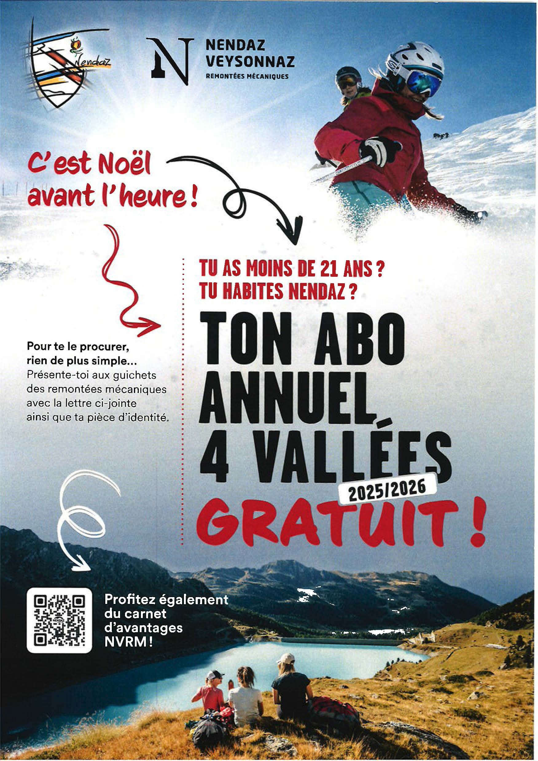 Dans le cadre de la politique communale visant à soutenir les familles et les jeunes, le Conseil communal renouvelle l’offre conjointe avec NV Remontées mécaniques SA (NVRM) qui permet à tous les jeunes de moins de 21 ans domiciliés sur le territoire communal de bénéficier gratuitement d’un abonnement annuel 4 Vallées (classe d’âge : 2005-2018, étant entendu que la gratuité s’applique déjà pour les plus jeunes).