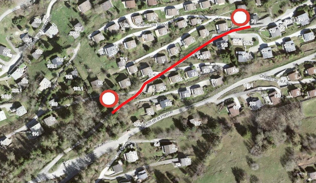 En raison de travaux de marquage, le chemin de la Fragnière à Haute-Nendaz sera fermé à la circulation le lundi 13 octobre 2025, de 8h à 17h, selon les plans ci-dessous :