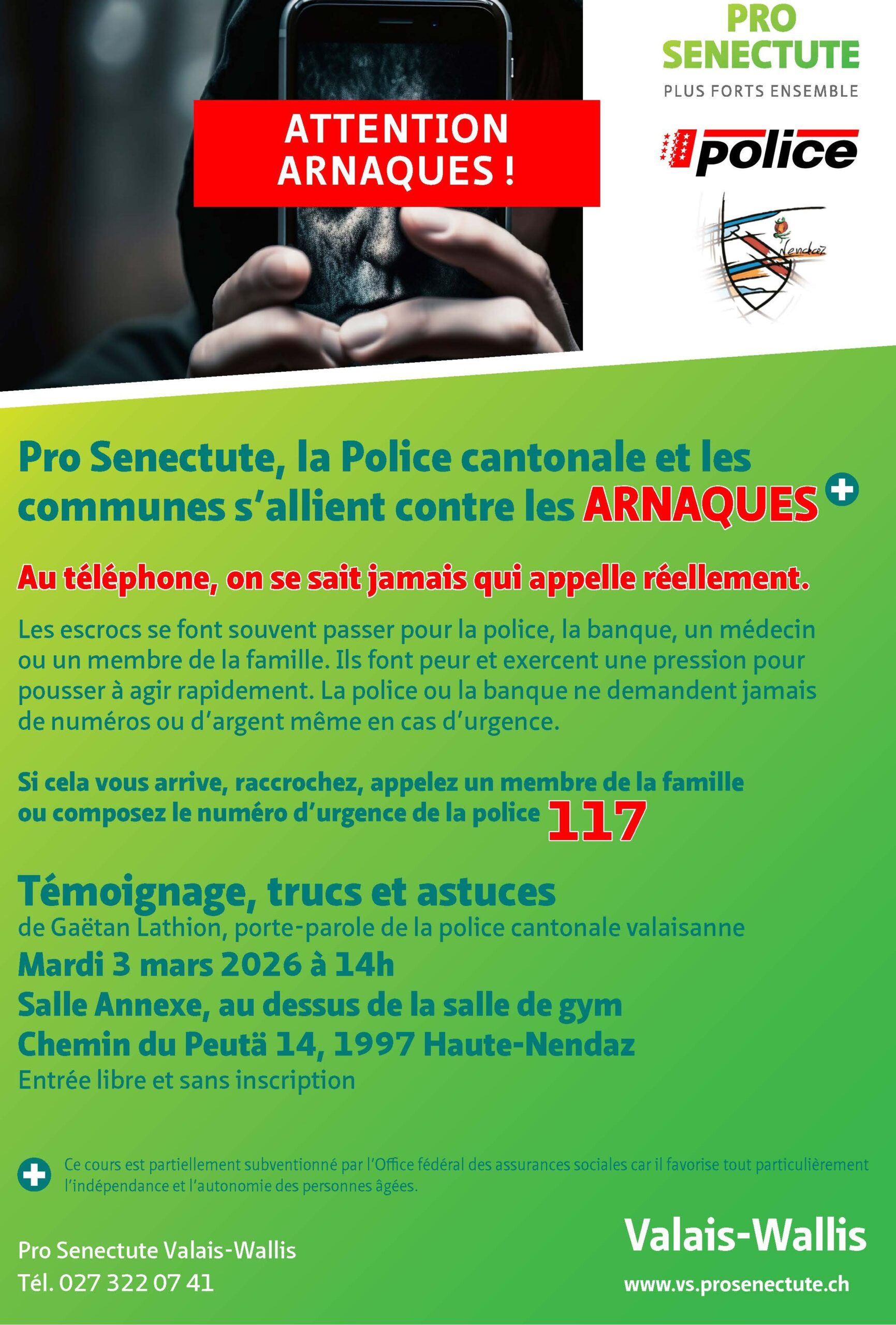 Pro Senectute et la Police cantonale proposent cette conférence de prévention contre les arnaques le mardi 3 mars à 14h dans l'annexe de la salle polyvalente à Haute-Nendaz.